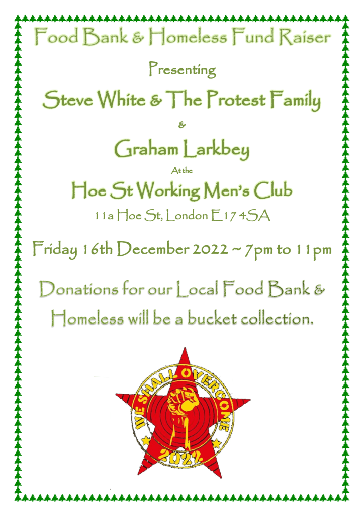 On Friday 16 December, we’ll be playing at a fundraiser for local food banks and supporting local homeless people at The Hoe Street Club in Walthamstow. It’ll be a rare outing for Steve, Lol and Simon playing as an acoustic (but plugged in) three-piece.