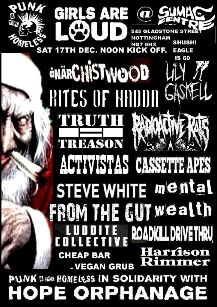And on Saturday 17 December, Steve makes the trip to Nottingham, acoustic guitar in hand, for a Punk 4 The Homeless all-dayer at the Sumac Centre and (shh) a celebration of Eagle’s birthday.