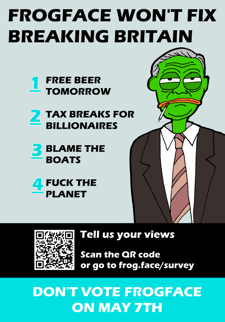 Don’t Vote Frogface Share this: Share on X (Opens in new window) X Share on Facebook (Opens in new window) Facebook Like Loading... April 19, 2026 by protestfamily Categories: SteveTags: farage, frogface, politics, reform Leave a comment