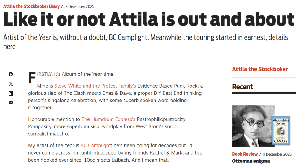 Leyton Orient’s house band Steve White and the Protest Family, truly radical folk with fire in their souls … deliver the goods with Trickledown Town, a ranting, dancing howl of rage at the state of the Tory nation…The royal family get nailed, the “anti-woke” right-wing media get nailed and a host of downtrodden characters get upbeat support.